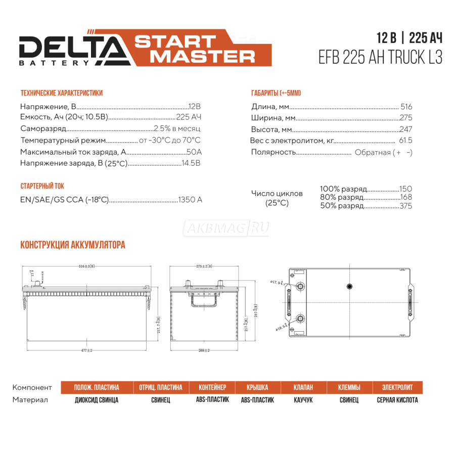 Габариты (мм) | 516x275x217 (длина, ширина, высота с клеммами) |