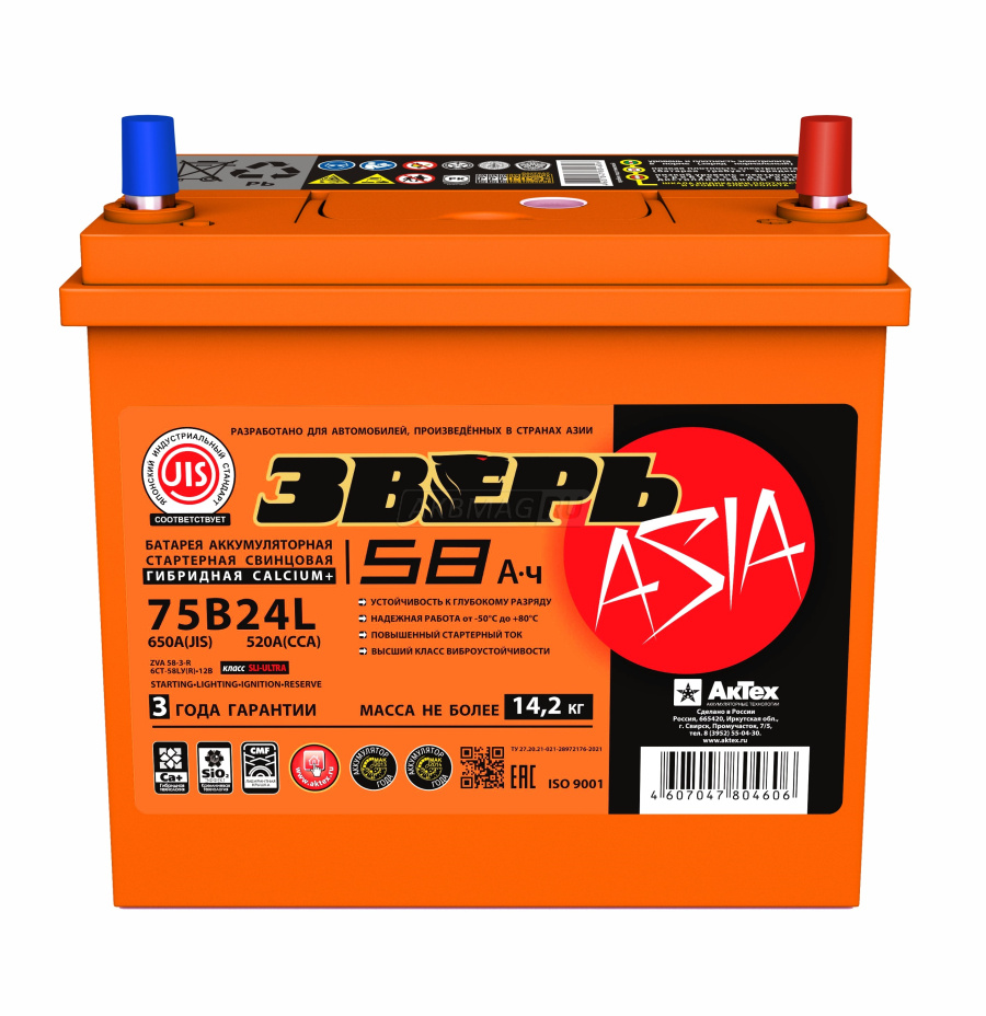 Аккумулятор автомобильный ЗВЕРЬ 75B24L (58R) 520 А обр. пол. 58 Ач (6CT-58LЗУ(R))